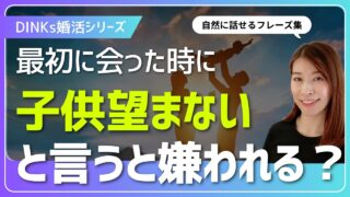 恋愛 【DINKs婚活】初対面の会話術|「子どもは望まない」を自然に伝える方法・相手の価値観を聞き取る方法 30代・40代からの大人の婚活を応援! Dinksを希望し婚活をしたい皆さんが、初対面のお見合いやお茶の場で、「子ど... 2025.09.22 恋愛